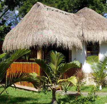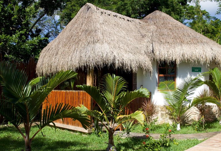 Cabañas rodeadas de selva con ventilación natural, ventilador y A/C.